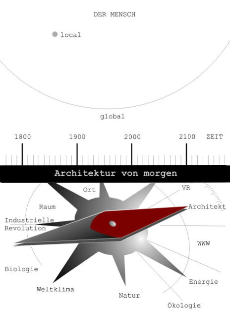wurden bereits hier durch die perspektivische Illusionsmalerei wie z.B. der Wettstreit >Der Vorhang des Parrasius< sowie die >Tauben des Zeuxis< versucht zu überschreiten. Seit Mitte des 20. Jahrhunderts entwickeln sich die Virtuelle Realität und die künstliche Intelligenz rasant. Die physische Differierung von Präsenz und Absenz ist im Begriff, eine maßgebende Erweiterung zu erfahren. Technik, Biologie sowie Real und Irreal scheinen zu verschmelzen. Die antike Definition des Ortes besagt, dass überall Ort ist und wo kein Ort ist durch die Erinnerung einer gemacht werden kann. Der Architektur ist es möglich einen amorphen Unort durch ein Gebäude zu einem Ort zu machen. Plattformen wie das World-Wide-Web in Verbindung mit der Virtuellen Realität treten den Medien mit Beginn der Industriellen Revolution entgegen bzw. erweitern diese: die Eisenbahn, das Dampfschiff, das Auto, das Luftschiff, das Flugzeug, das Telefon, das World-Wide-Web, die Virtuelle Realität (VR). Physikalische und physische Grenzen verlieren an Ortsgebundenheit. Die Architektur von morgen nimmt in 21. Jahrhundert / 3. Jahrtausend durch immer neuere hybride Entwicklungen mehr und mehr an Gestalt an.